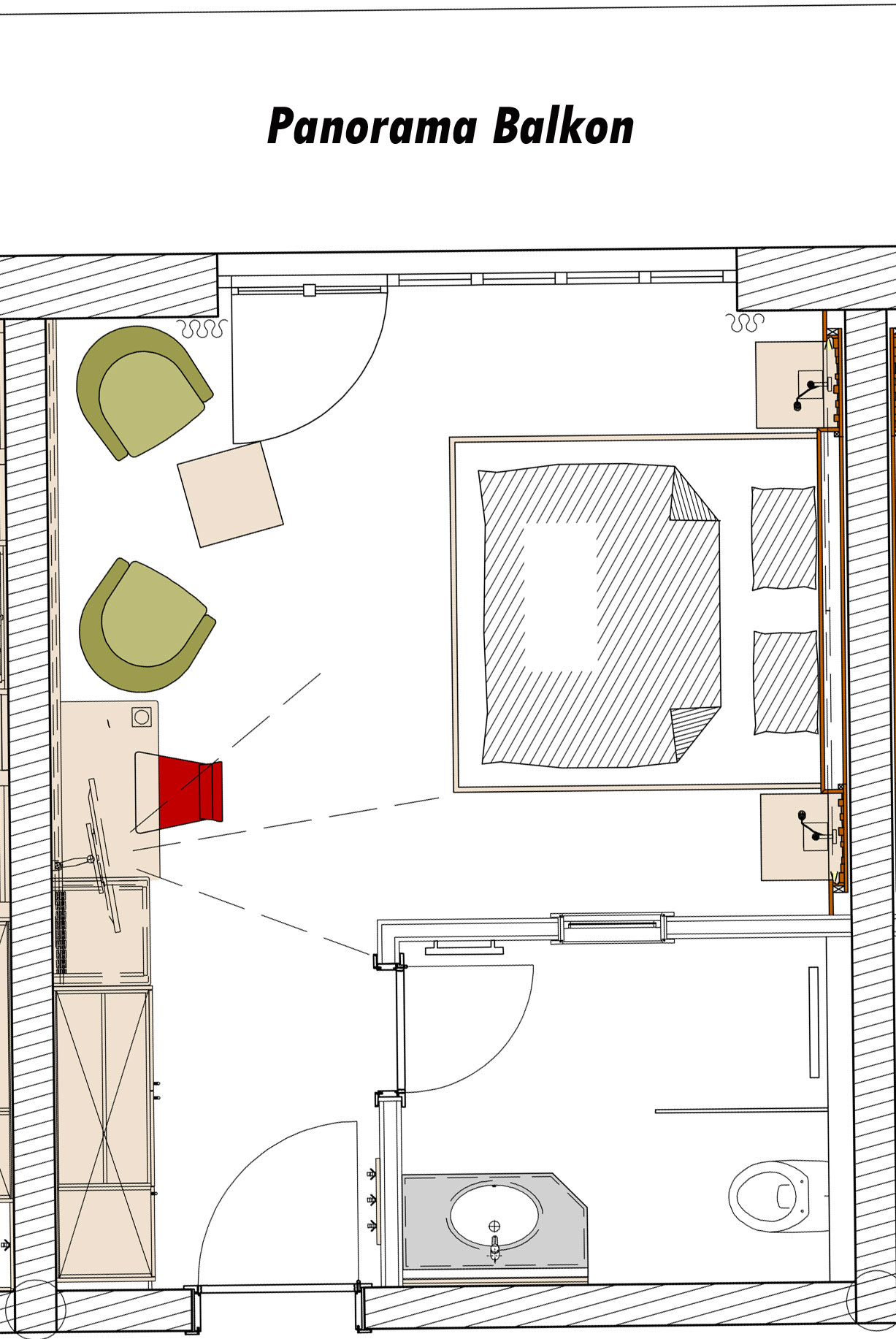 Für 2 Personen, ca. 25 m², übergroße Betten (2,00 m x 2,10 m), uriges Altholz Interieur, Dusche/WC, Balkon Richtung Westen und Osten, Sitzecke