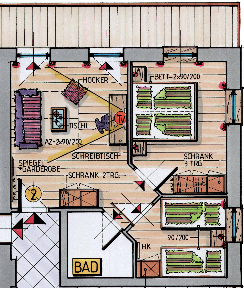 Für 2 bis 4 Personen, ca. 55 m², Doppelbett (1,80 m x 2,00 m) und zusätzliches Schlafzimmer mit zwei Einzelbetten (0,90 m x 2,00 m), Balkon Richtung Westen, separatem Wohnraum, Sitzecke mit ausziehbarer Couch, edles Zirbenholz und Eichenholzboden, Nespresso Maschine, 2x TVKinderpreise pro Kind/Nacht inkl. Tonihof-Verwöhnpension: